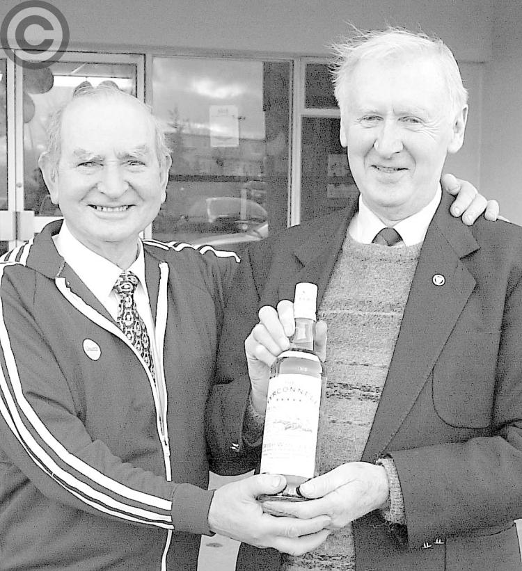 Tommy Hanratty and Jim McCooey of the Dowdallshill GFC and AC Christmas Morning Run with a special bottle of Cooley Distillery Whiskey to mark the 40th Anniversary of the run to St. Oliver's Hospital on Christmas Morning.