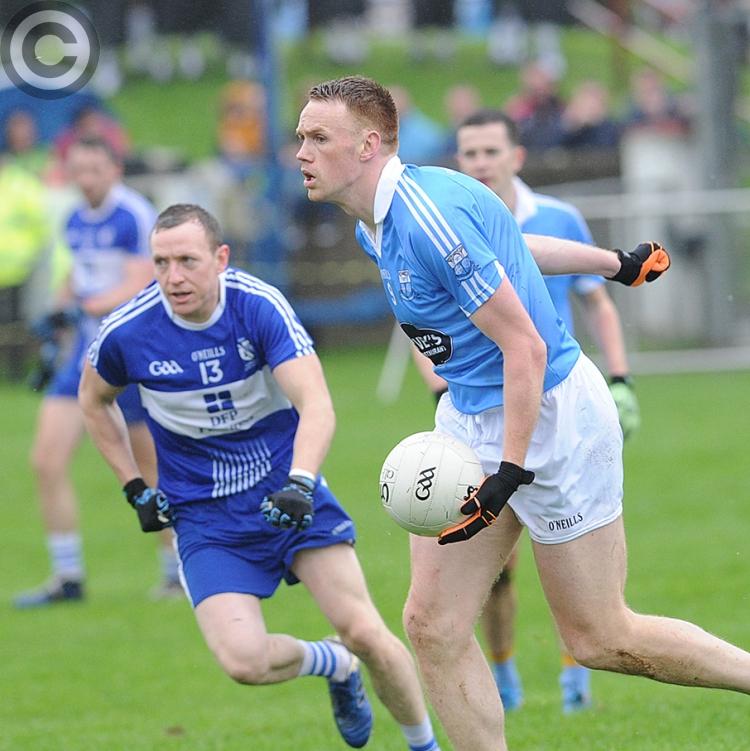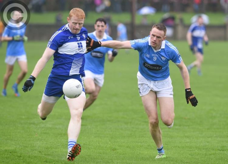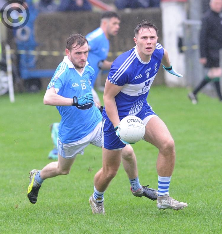 James Stewart delivers forward for Dundalk Gaels with Blues' Conor Moore in pursuit. (Pic: Arthur Kinahan)