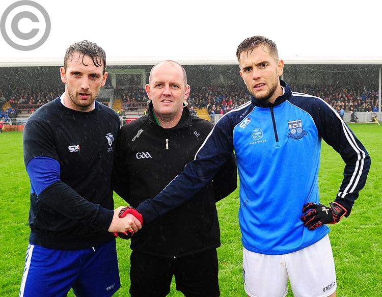 Captains Derek Crilly (Gaels) and Andy McDonnell (Blues) with match referee David Fedigan. (Pic: Arthur Kinahan)