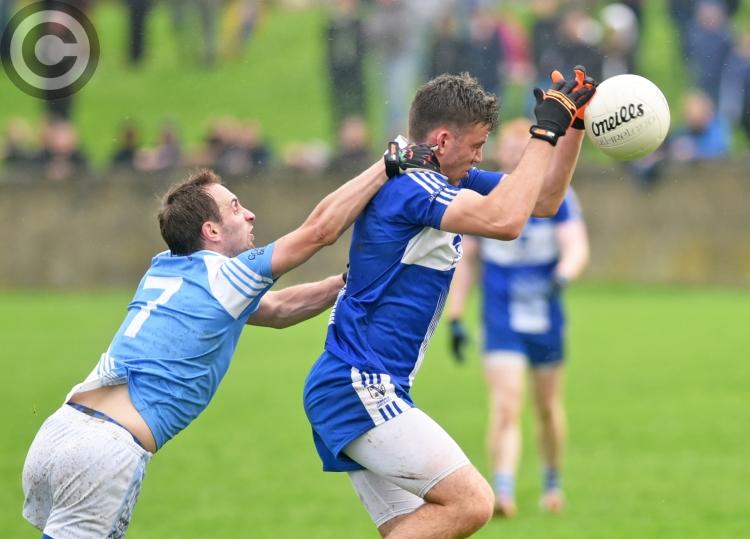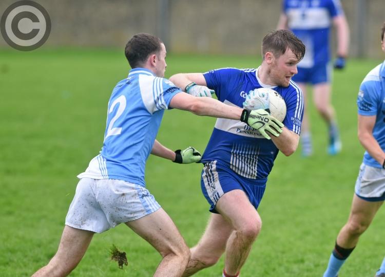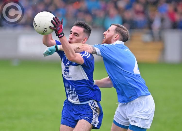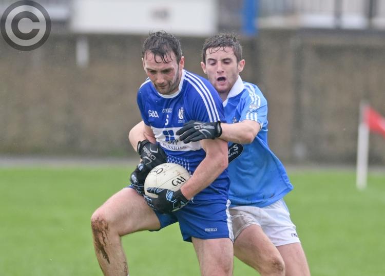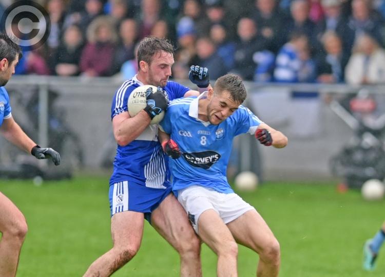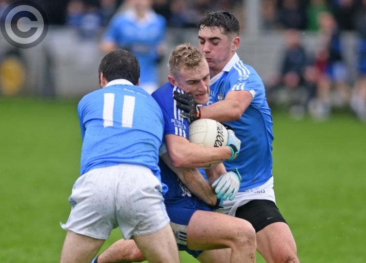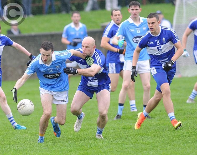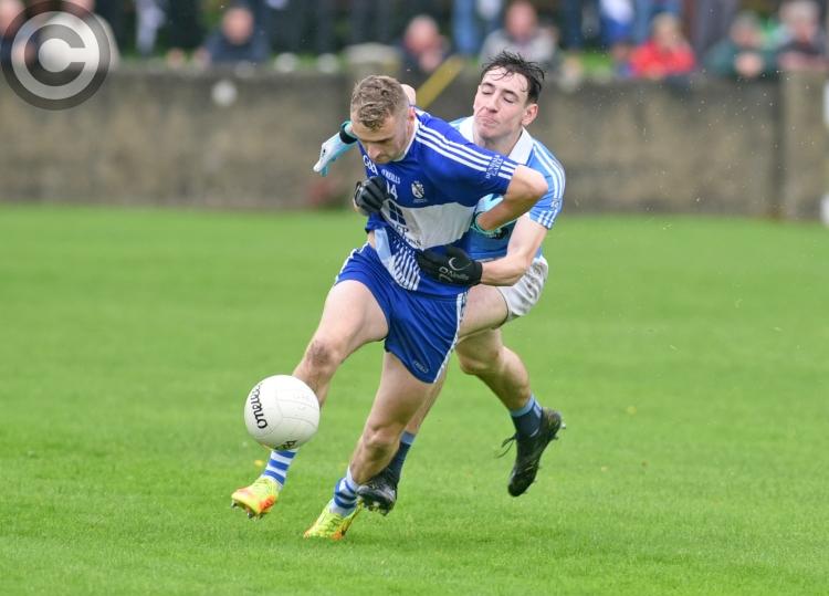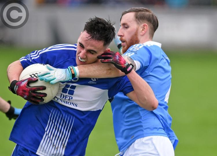 Gaels' Chris Sweeney is confronted by Blues defender Paul Moore. (Pic: Ciarán Culligan)