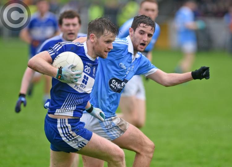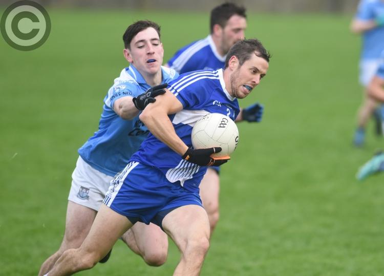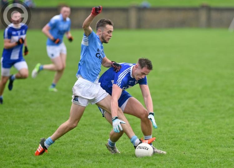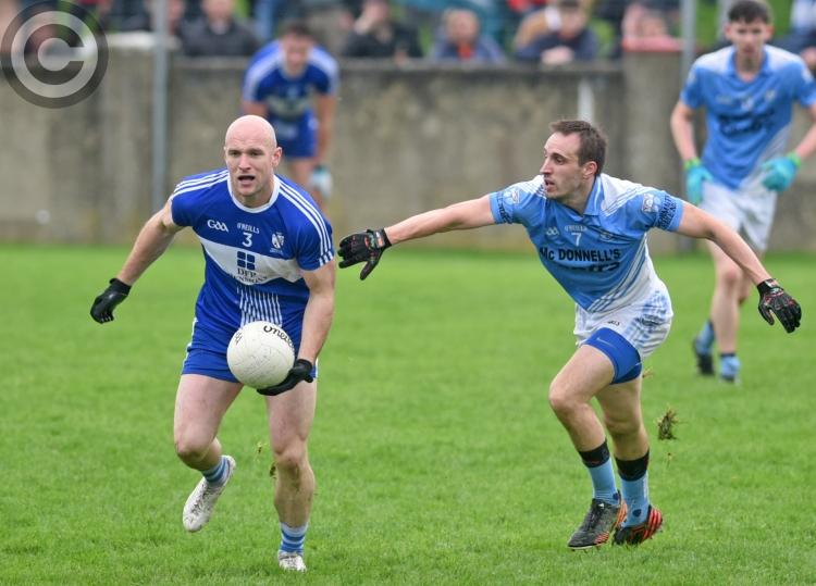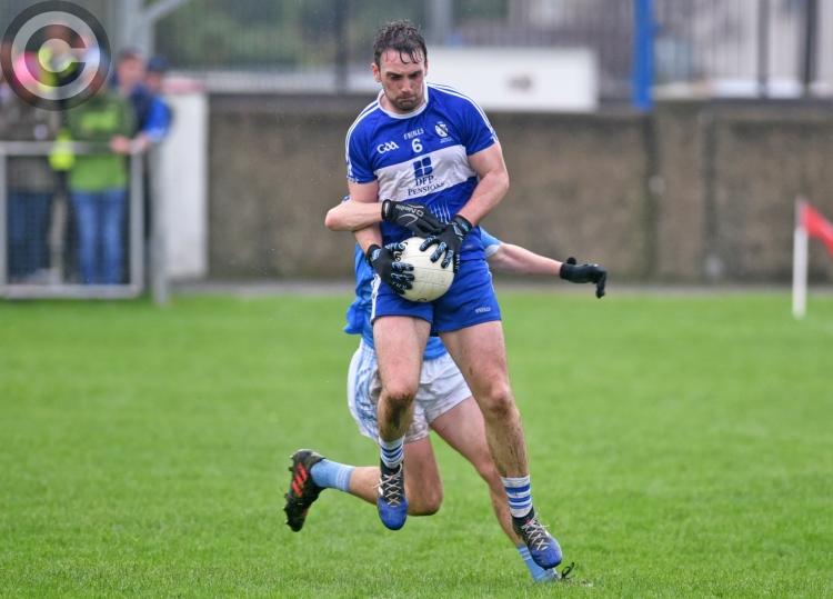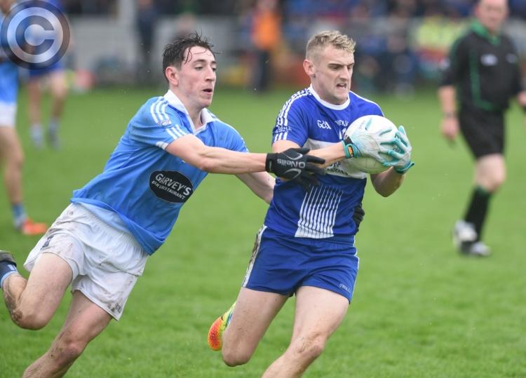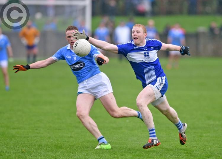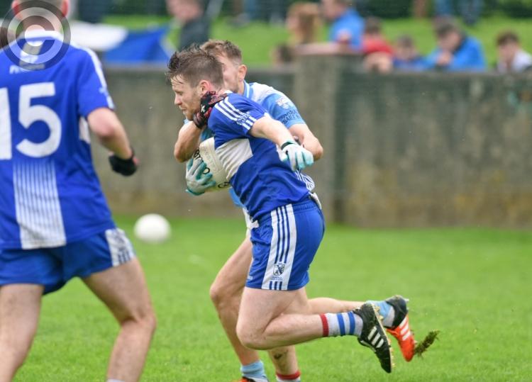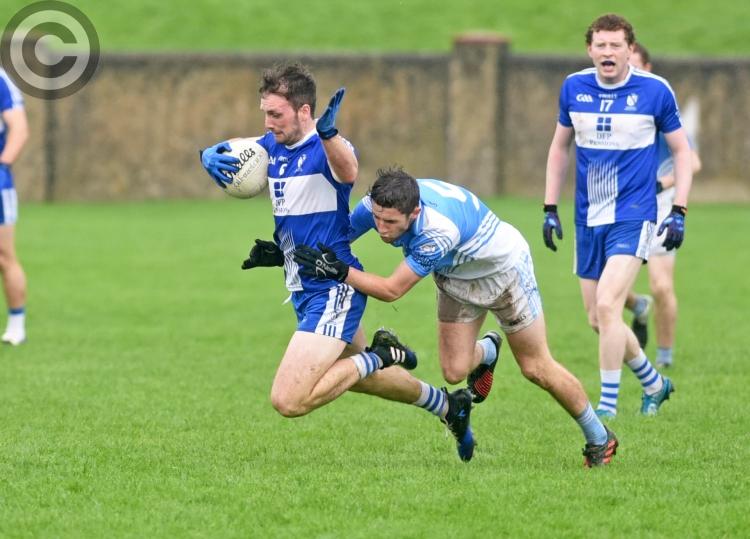 Gaels' Chris Sweeney is confronted by Blues defender Paul Moore. (Pic: Ciarán Culligan)