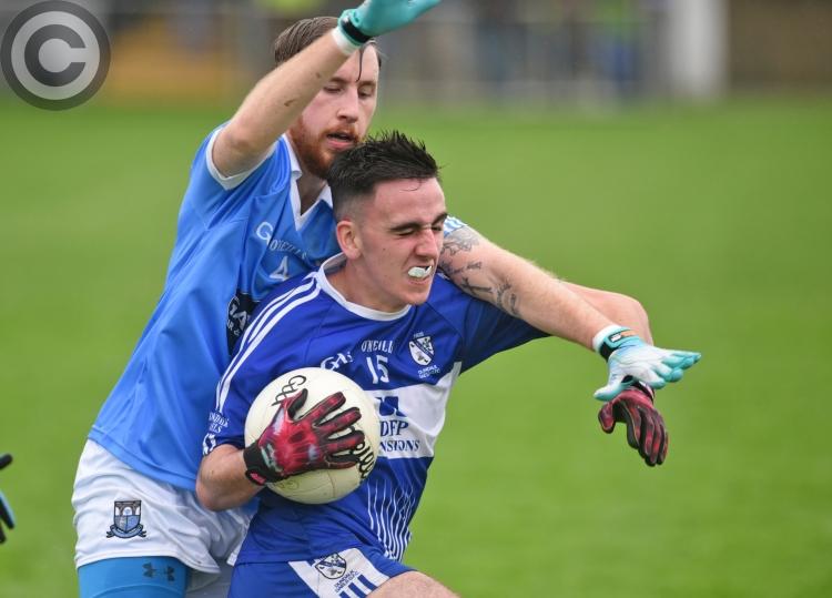 Seán Murray of Dundalk Gaels and Stephen Moonan of Newtown Blues. (Pic: Ciarán Culligan)