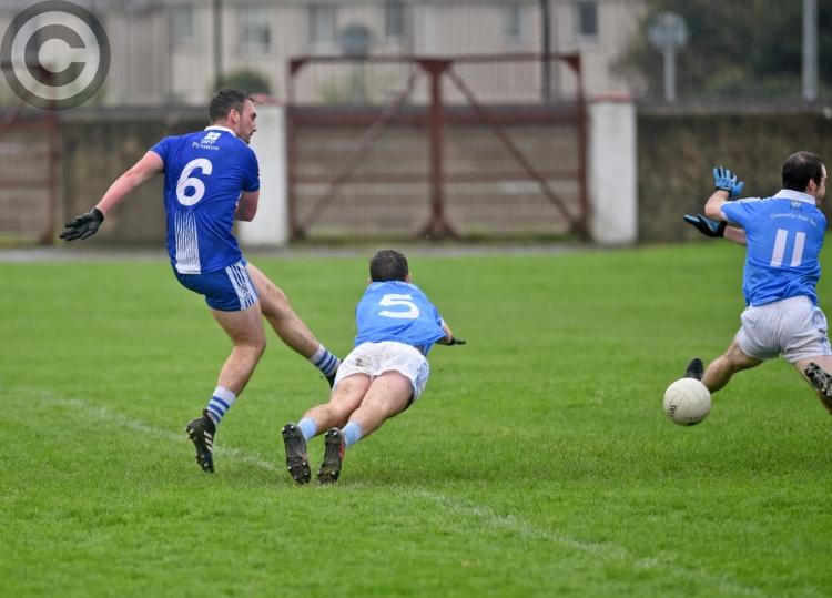 Dundalk Gaels' Derek Crilly sees his shot blocked by Blues' Kevin Carr (5) and Colm Judge. (Pic: Ciarán Culligan)