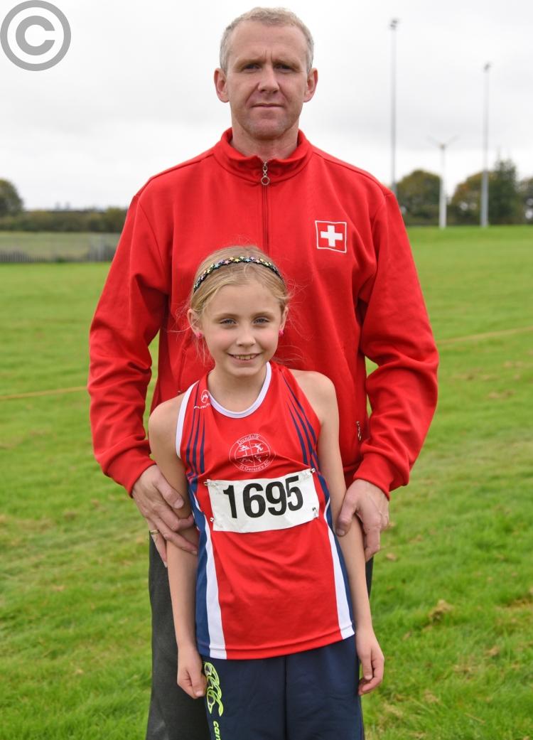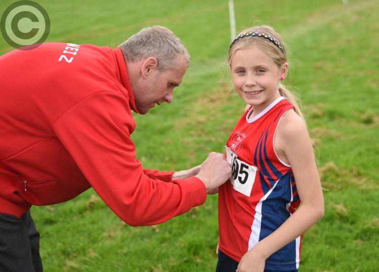 St Gerard AC’s Enya Silkena gets help attach her bib number from dad Modris Silkens. (Pic: Ciarán Culligan) -
