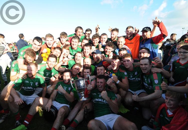 Junior Football ChampionshipIN PICTURES | Glen Emmets win Junior Football ChampionshipArthur Kinahan captured the Tullyallen men's triumph Reporter: Caoimhín Reilly26 Sept 2017 Email: caoimhin.reilly@dundalkdemocrat.ie Referee Colm McCullough with captains Trevor O'Brien (Glyde Rangers) and Tom Grimes (Glen Emmets). (Pic: Arthur Kinahan) Emmets' Ian Cusack is tackled by Glyde Rangers opponent Conor Sheridan. (Pic: Arthur Kinahan) Andrew Mooney was outstanding for Glen Emmets. (Pic: Arthur Kinahan) David Bracken (Glen Emmets) is watched by Glyde's Aaron Devlin. (Pic: Arthur Kinahan) Bracken pulls the trigger. (Pic: Arthur Kinahan) Ciarain Sheridan of Glyde is surveyed from behind by Seán Byrne of Glen Emmets. (Pic: Arthur Kinahan) Niall Sharkey on the ball for Glyde. (Pic: Arthur Kinahan) Glen Emmets' Evan English lunges to deny Trevor O'Brien of Glyde a route to goal. (Pic: Arthur Kinahan) Glen Emmets celebrate in the sun. (Pic: Arthur Kinahan) James Butler receives his Man of the Match accolade. (Pic: Arthur Kinahan) Ronan Grufferty, in the absence of injured captain Tom Grimes, raises Christy Bellew aloft. (Pic: Arthur Kinahan) Grufferty receives the crown... (Pic: Arthur Kinahan) Glen Emmets lifted the Christy Bellew Cup for the first time since 2012 on Sunday afternoon with victory over Glyde Rangers in Castlebellingham. Click here for match report and here and here for reaction to their triumph.