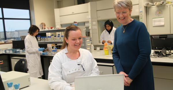 DkIT President, Ann Campbell with students in Science Lab on Campus.