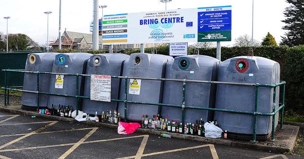 Glass bottles littered around overflowing Dundalk bottle bank
