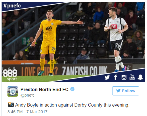Boyle started the game, away to Derby County, alongside Paul Huntington as Simon Grayson's side drew 1-1 at Pride Park. The Dubliner spent seven games on Preston's bench as an unused substitute before making his debut.