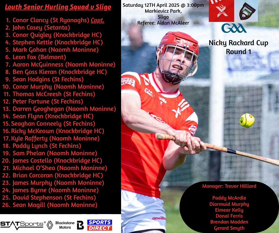 Louth senior hurling manager, Trevor Hilliard, has named his team to take on Sligo in the Nickey Rackard, Round One, fixture at Markievicz Park, Sligo, on Saturday afternoon at 3.00pm.
