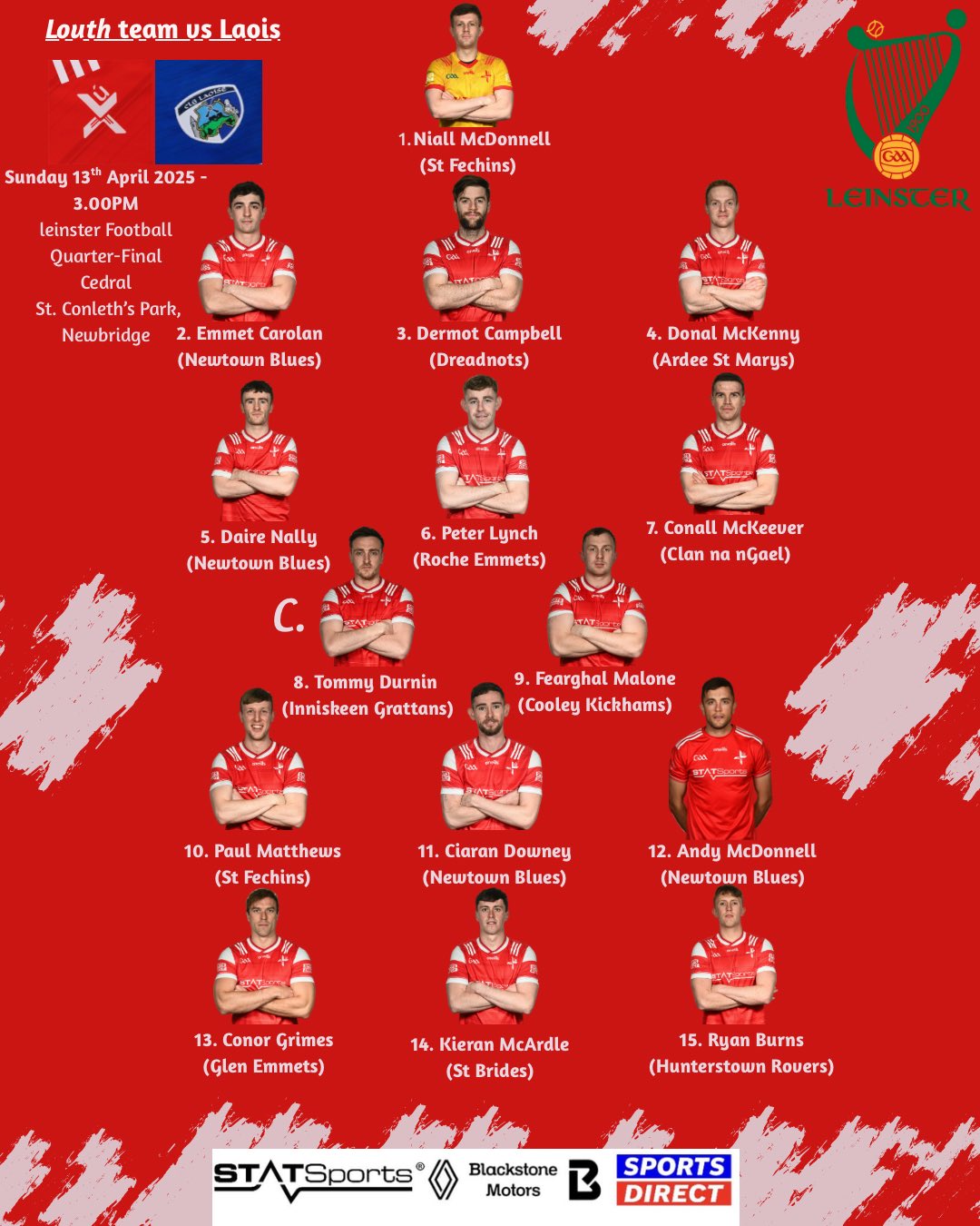 The Louth team has been named as: 1. Niall McDonnell; 2. Emmet Carolan, 3. Dermot Campbell, 4. Donal McKenny; 5. Daire Nally, 6. Peter Lynch, 7. Conall McKeever; 8. Tommy Durnin (c), 9. Fearghal Malone; 10. Paul Matthews, 11. Ciarán Downey, 12. Andy McDonnell; 13. Conor Grimes, 14. Kieran McArdle, 15. Ryan Burns.