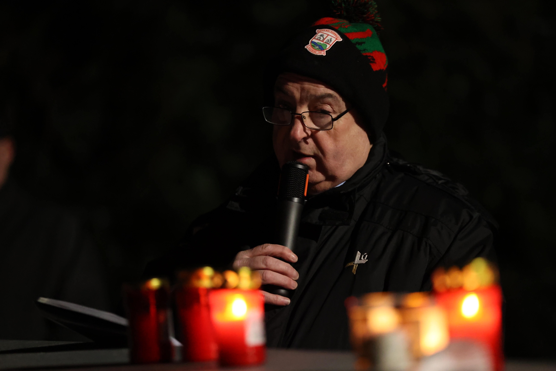 Rev Dermot Clarke, Deacon of the parish of Haggardstown and Blackrock, speaks during a vigil at Sean McDermott's GFC in Mountrush