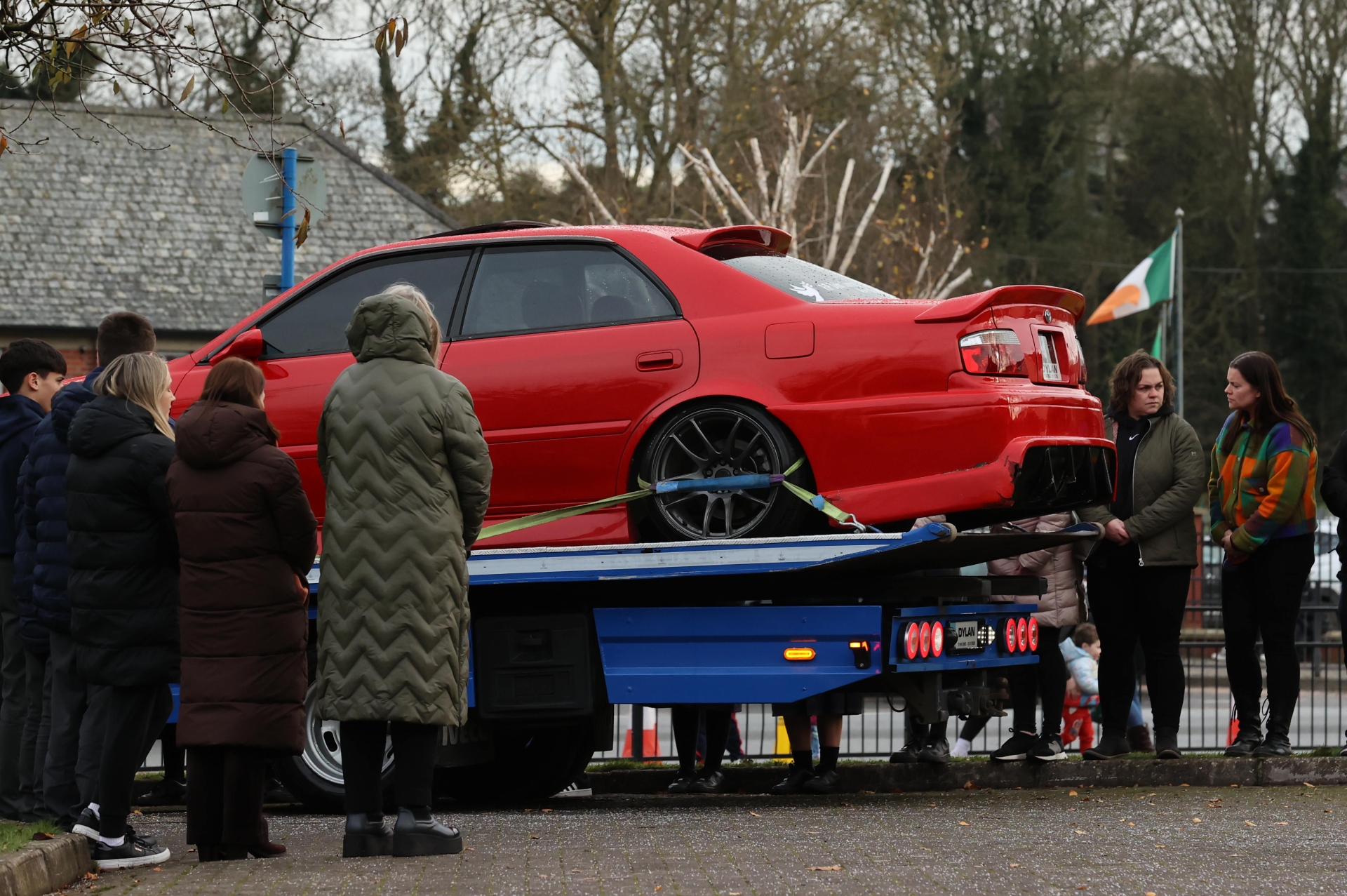 The coffin of Dylan Commins arrived at the Church of the Nativity of Our Lady in Ardee along with a bright red car on the back of a recovery truck.