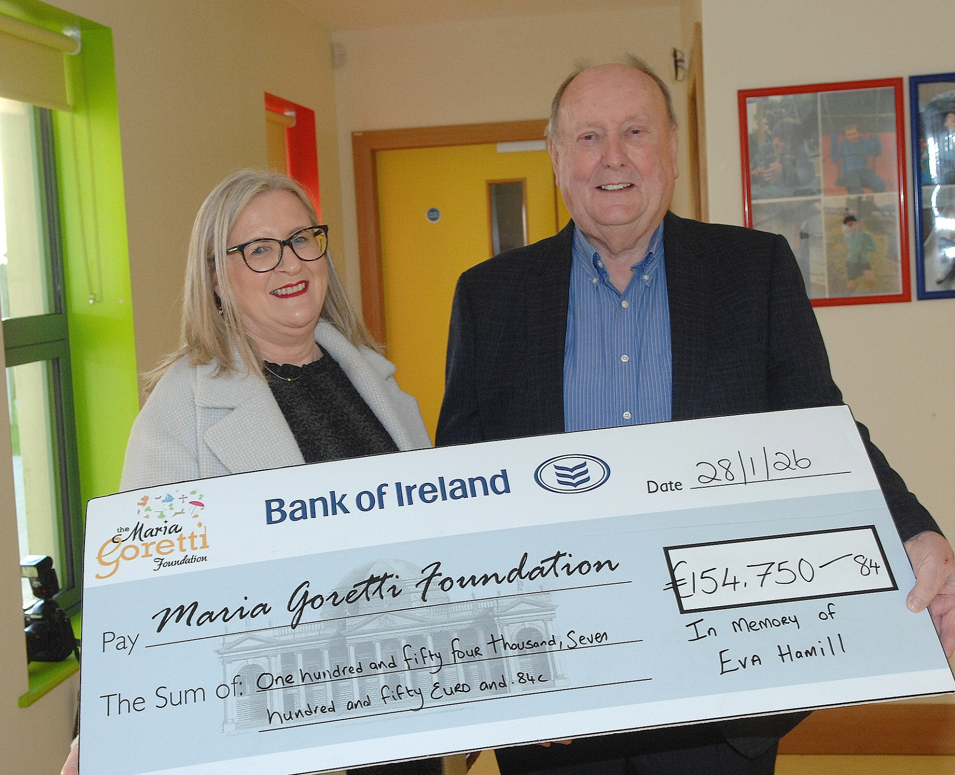 On Thursday a cheque for over €150,000 was presented to the Maria Goretti Foundation in memory of the late Eva Hamill, a lifelong resident of Bellurgan.