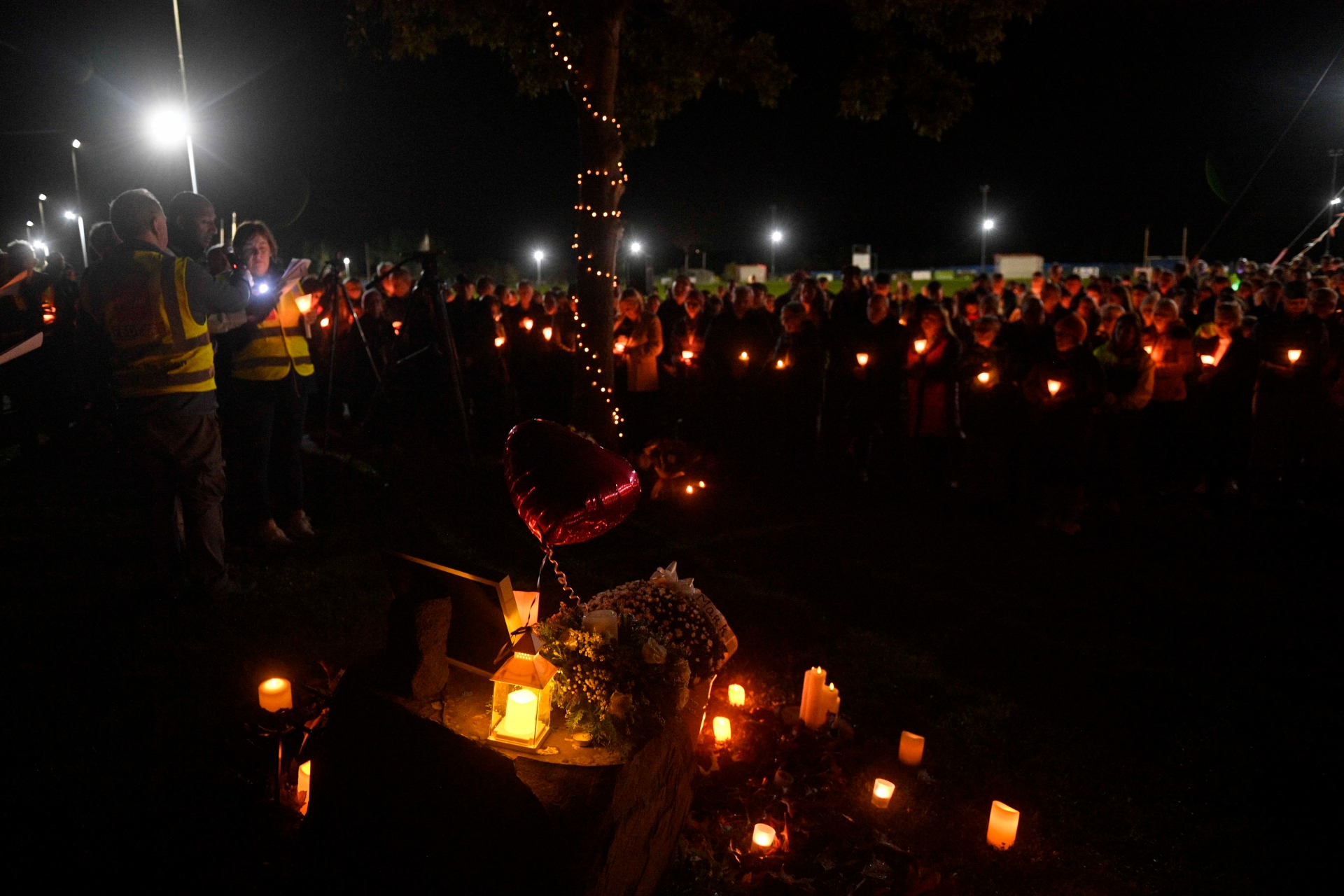 A person lighting a candle during a vigil in Louth for Mark and Louise O'Connor and their son Evan, whose bodies were found at the family's home in Dromgowna. Pic: Mark Marlow/PA Wire