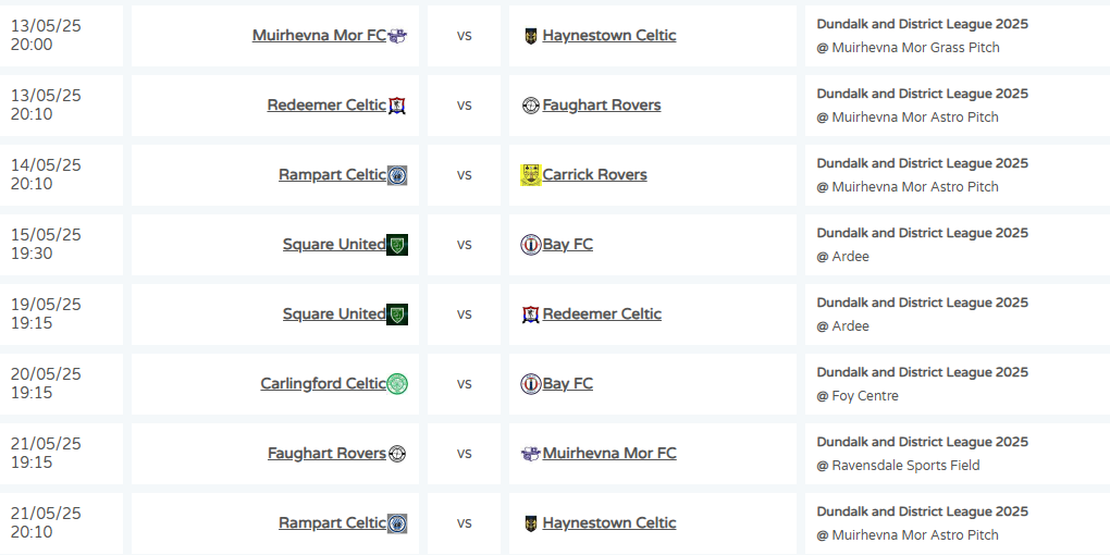 Wednesday, 19th May: Rampart Celtic v Haynestown. Muirhevnamor. All weather. 8-10pm.