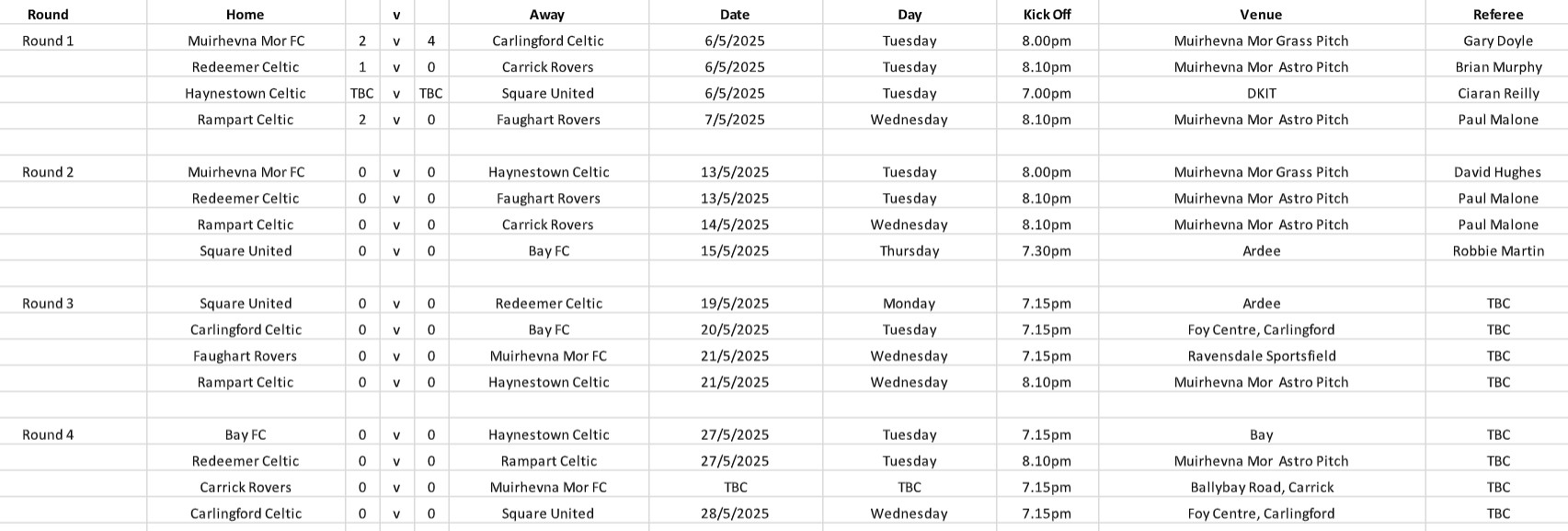 Tuesday, 18th May: Muirhevnamor FC v Faughart Rovers. Muirhevnamor. Kick-off at 8.1pm.