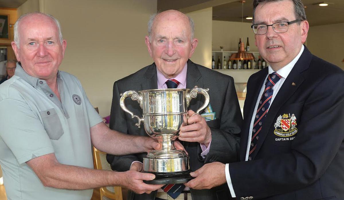 Declan Mackin, (The Neptune) presents The Veterans Cup to Harry O'Hanrahan, with Gerry McDermott, Captain, Dundalk Golf Club at a presentation night. Photo by Ken Finegan/Newspics Photography