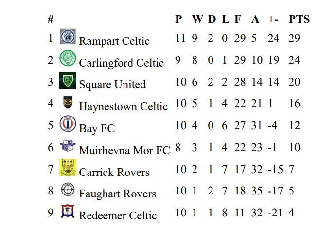 Top goal scorers: Colm Bracken (Bay FC) 10 goals, Micky O'Kane (Muirhevnamor FC) 9 goals, Ross Gaynor (Square United) 8 goals Eddie Duffy (Carlingford Celtic) 7 goals, Daniel Duffy (Muirhevnamor FC) 7 goals, Peter Shields (Carlingford Celtic) 5 goals, Aidan McGuinness (Rampart Celtic) 5 goals, William Opoku (Bay FC) 6 goals, Arthur Sands (Square United) 6 goals.