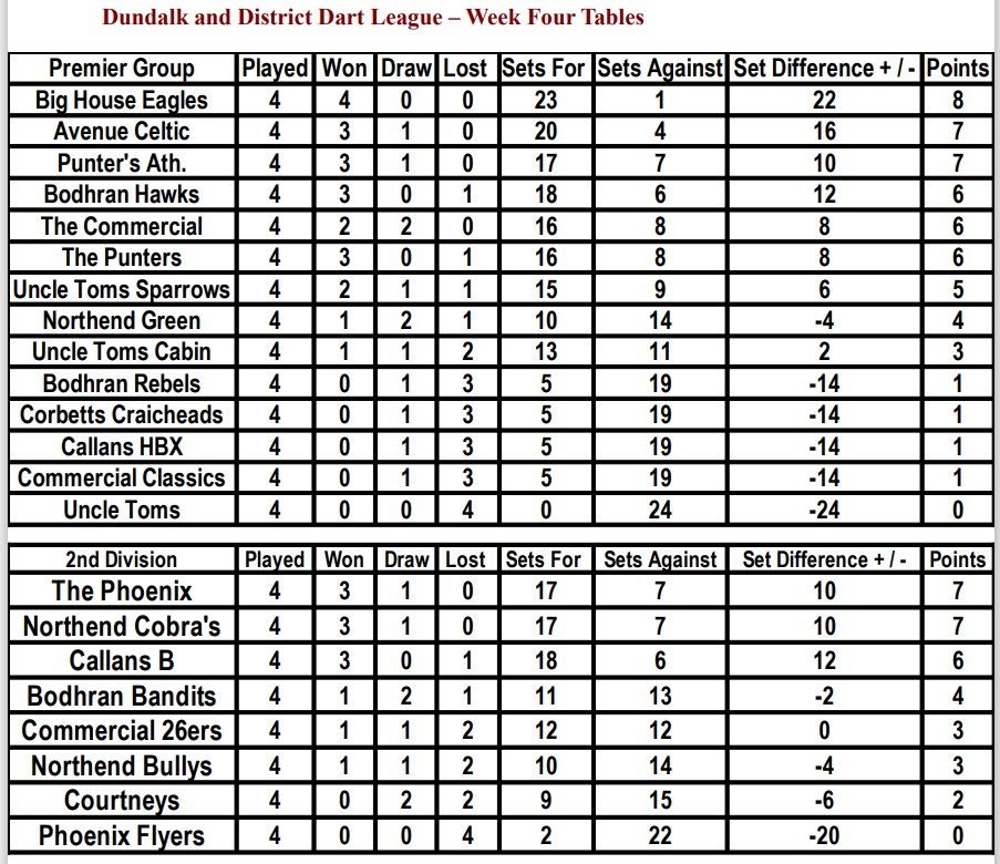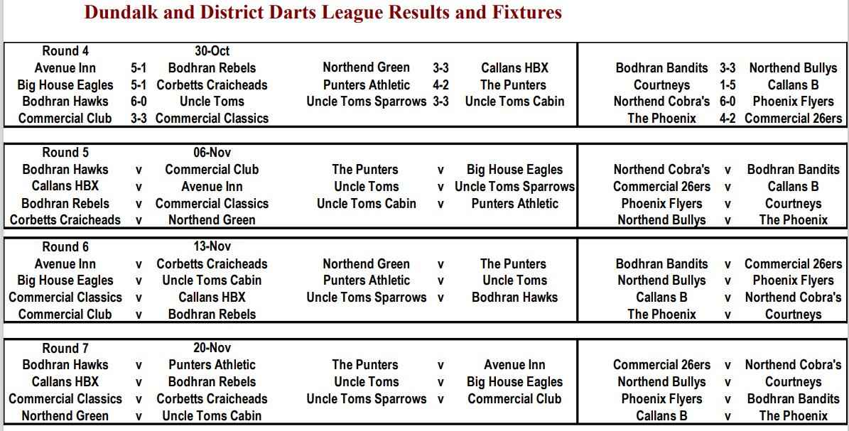 Week four of the Heineken-sponsored Dundalk and District Dart League saw a number of Derby matches taking place. First up was the Commercial, where the Commercial Club were host to Commercial Classics.