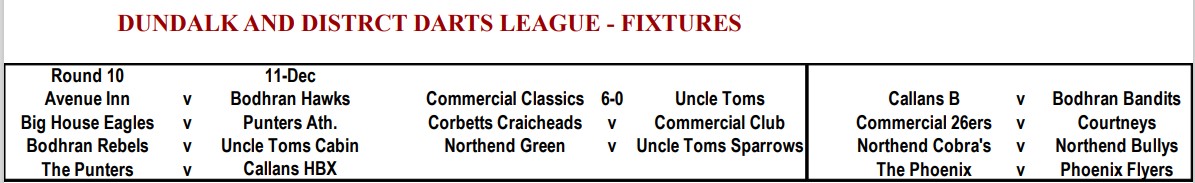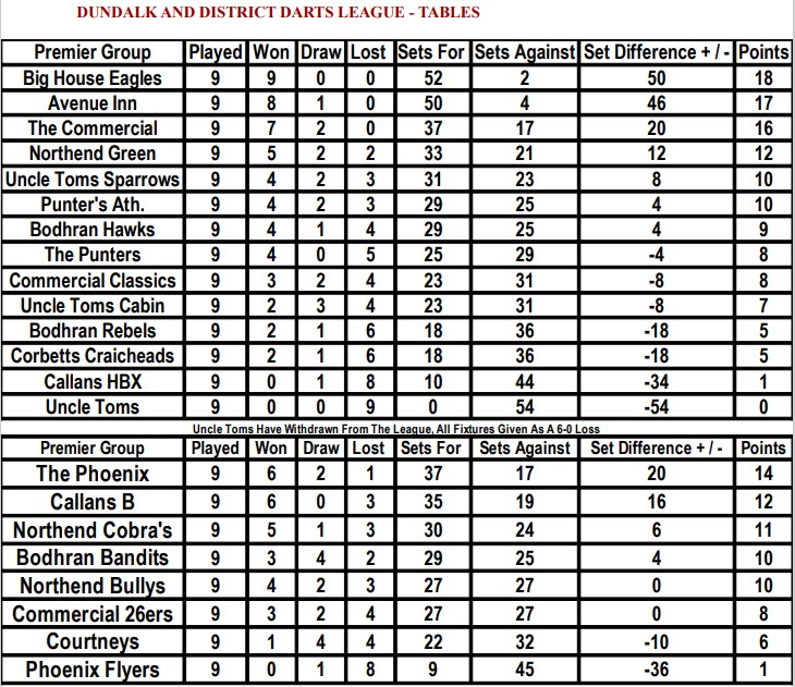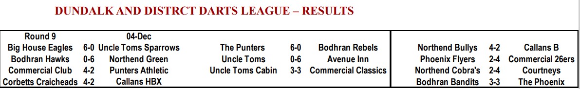 Week nine of the Heineken-sponsored Dundalk and District Dart League took place last Thursday night.