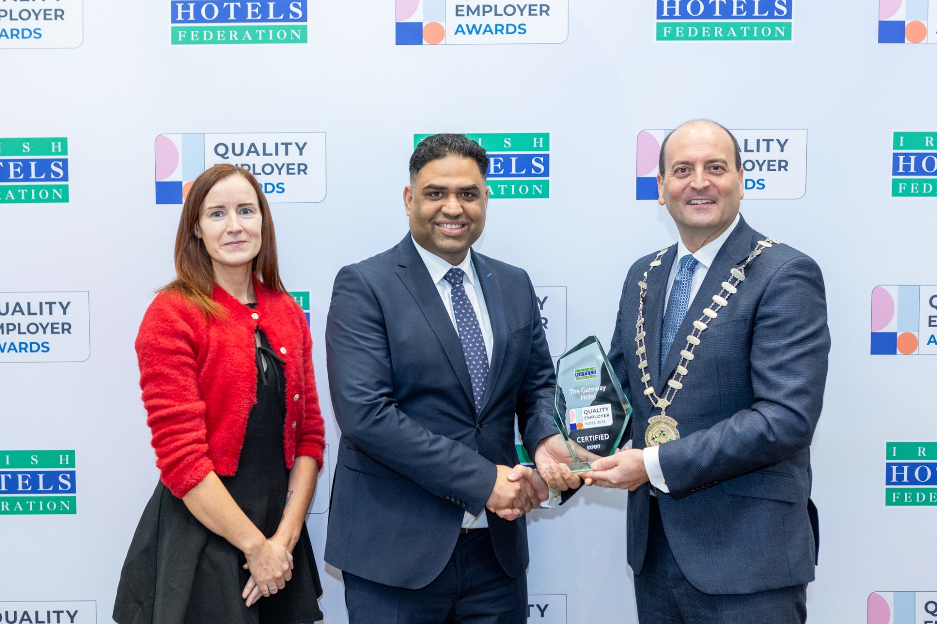 Majella Gorman and Gaurav Joshi from The Gateway Hotel, Dundalk pictured with Irish Hotels Federation (IHF) President Michael Magner at the inaugural Quality Employer Awards where they were awarded Quality Employer Expert Level Certification in recognition of achievements in HR best practices and people management