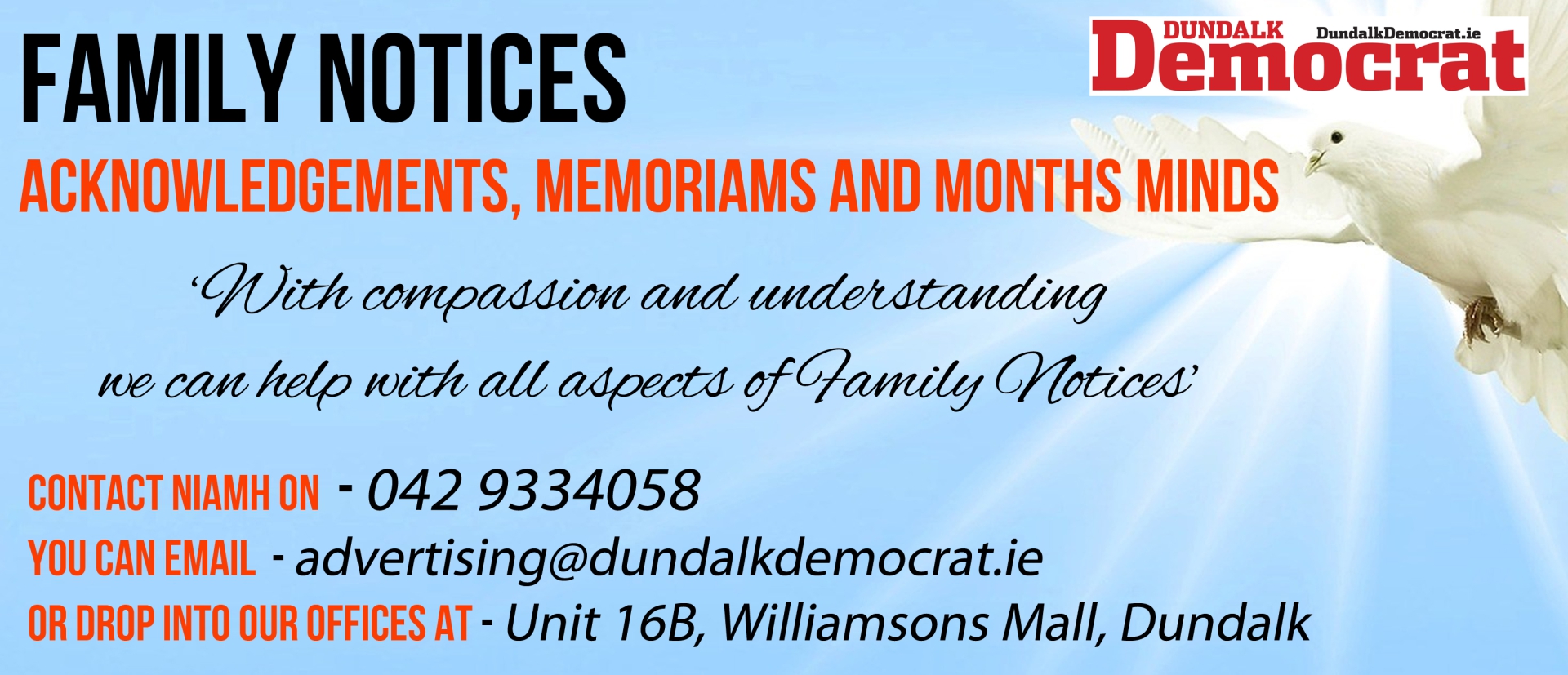 Removal on Tuesday morning to Saint Brigid's Church, Dunleer arriving for Funeral Mass at 11am. Burial afterwards in Mosstown Cemetery. Family flowers only. Donations,if desired, in lieu to Palliative Care Team, Dochas Centre, Drogheda.