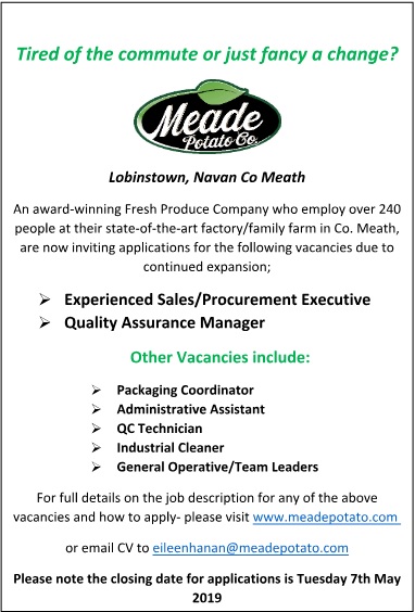 For full details on the job description for any of the above vacancies and how to apply- please visit www.meadepotato.com or email CV to eileenhanan@meadepotato.com