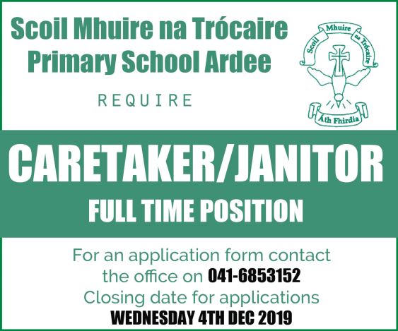 Scoil Mhuire na Trócaire Primary School, Ardee requires a Caretaker/Janitor of a Full Time position