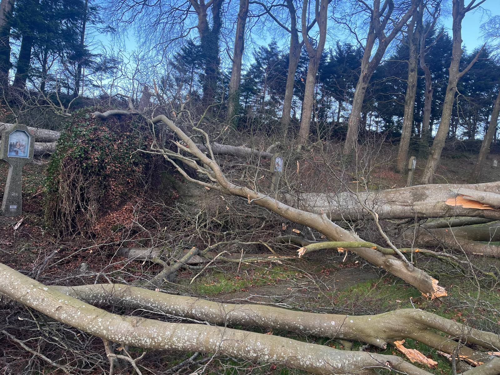 Below: Fallen trees by the Stations of the Cross