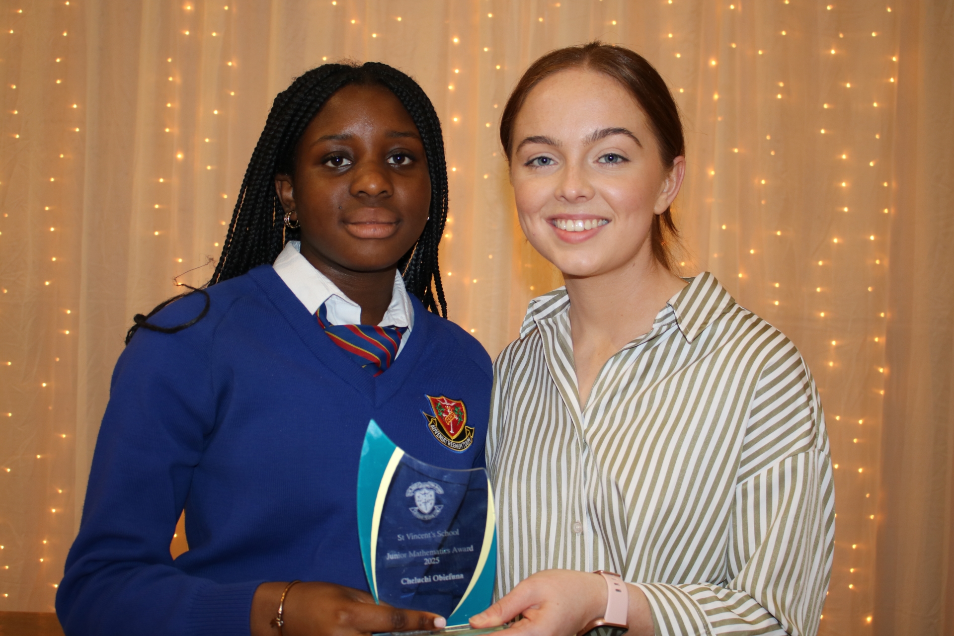 Below: Eimear Casey presents The Junior Mathematics Award to Cheluchi Obiefuna