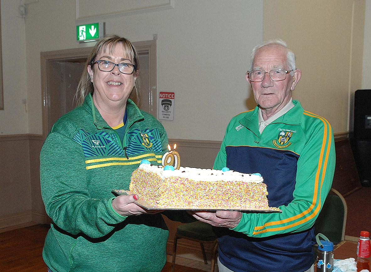 Below: Clan Na Gael Chairperson Paula Harrison presenting a birthday cake to Willie Dixon