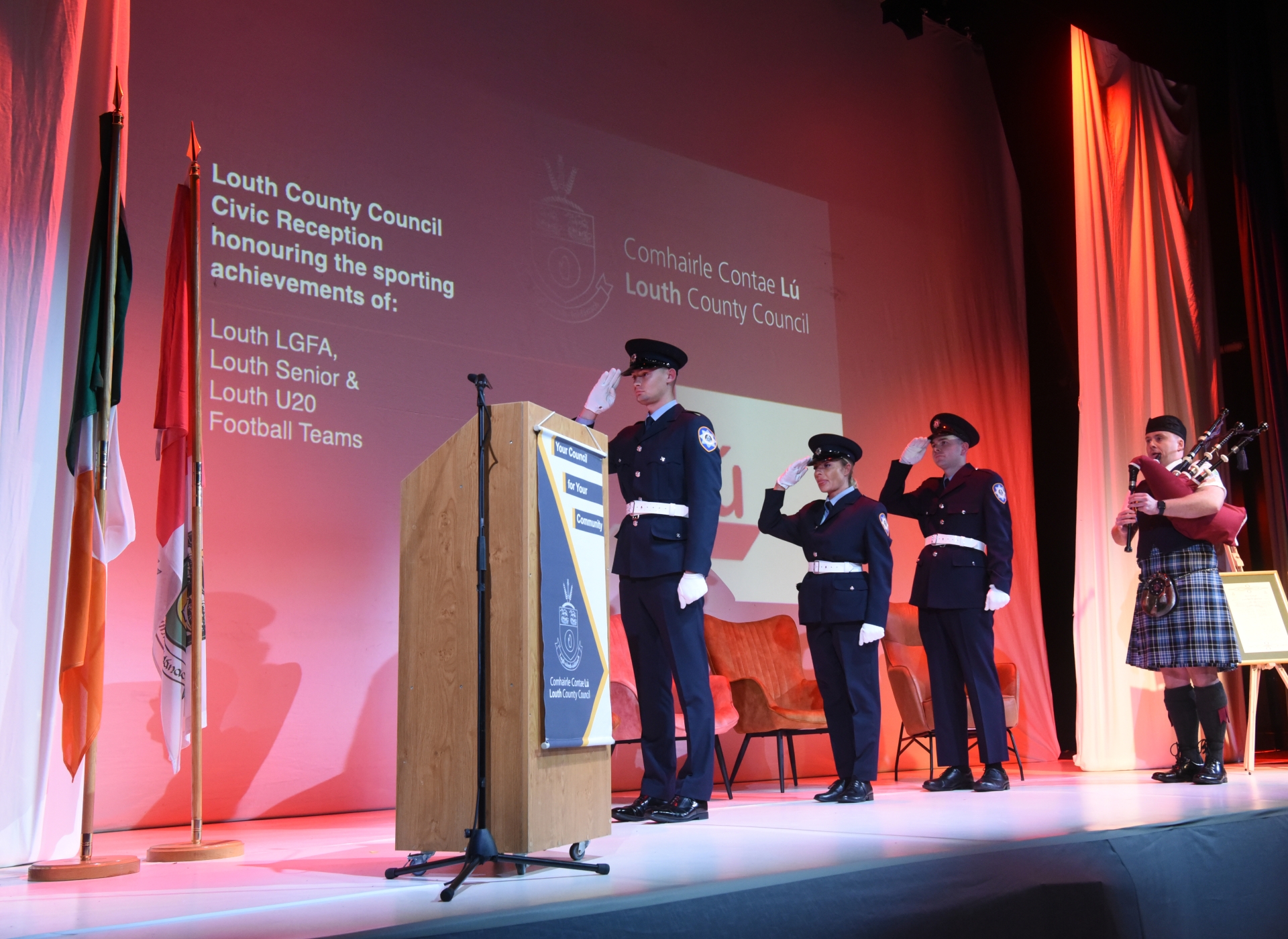 Firefighters Uli Keller, Dita Durse and Stephen Grey of Louth County Council Fire and Rescue Service parade the National Flag alongside the flag of County Louth accompanied by Firefighter Niall Clarke on the bagpipes at a Civic Reception honouring the sporting achievements of the three county teams during the 2025 Gaelic football season.