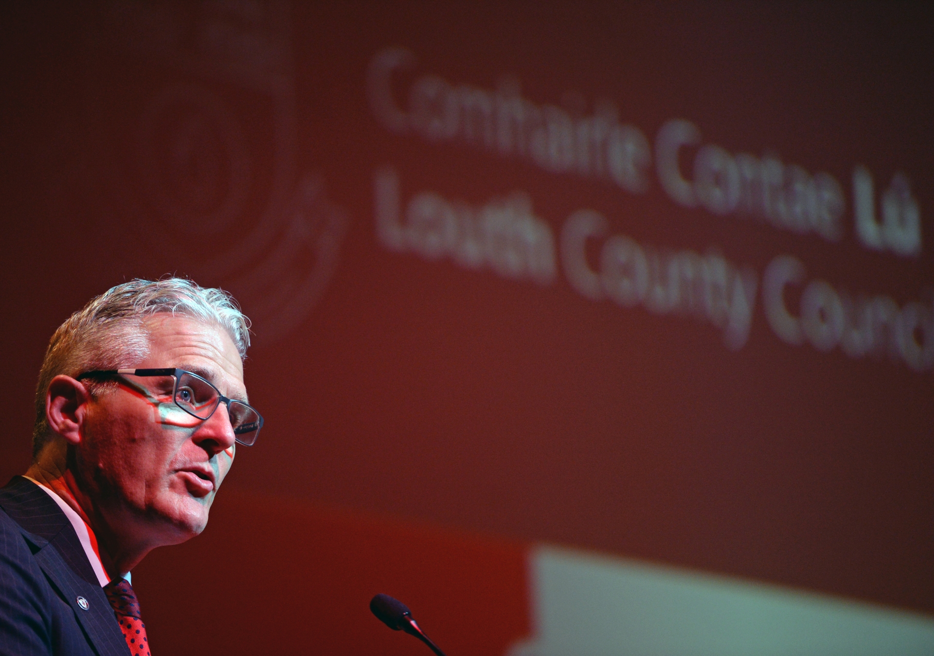 GAA President Jarlath Burns addresses the honourees and invited guests at a Civic Reception honouring the sporting achievements of the three county teams during the 2025 Gaelic football season.