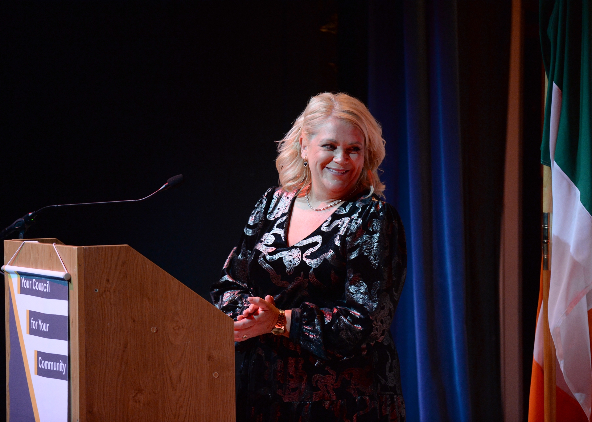 Louth LGFA Chairperson Amanda Lane addresses the honourees and invited guests at a Civic Reception honouring the sporting achievements of the three county teams during the 2025 Gaelic football season.