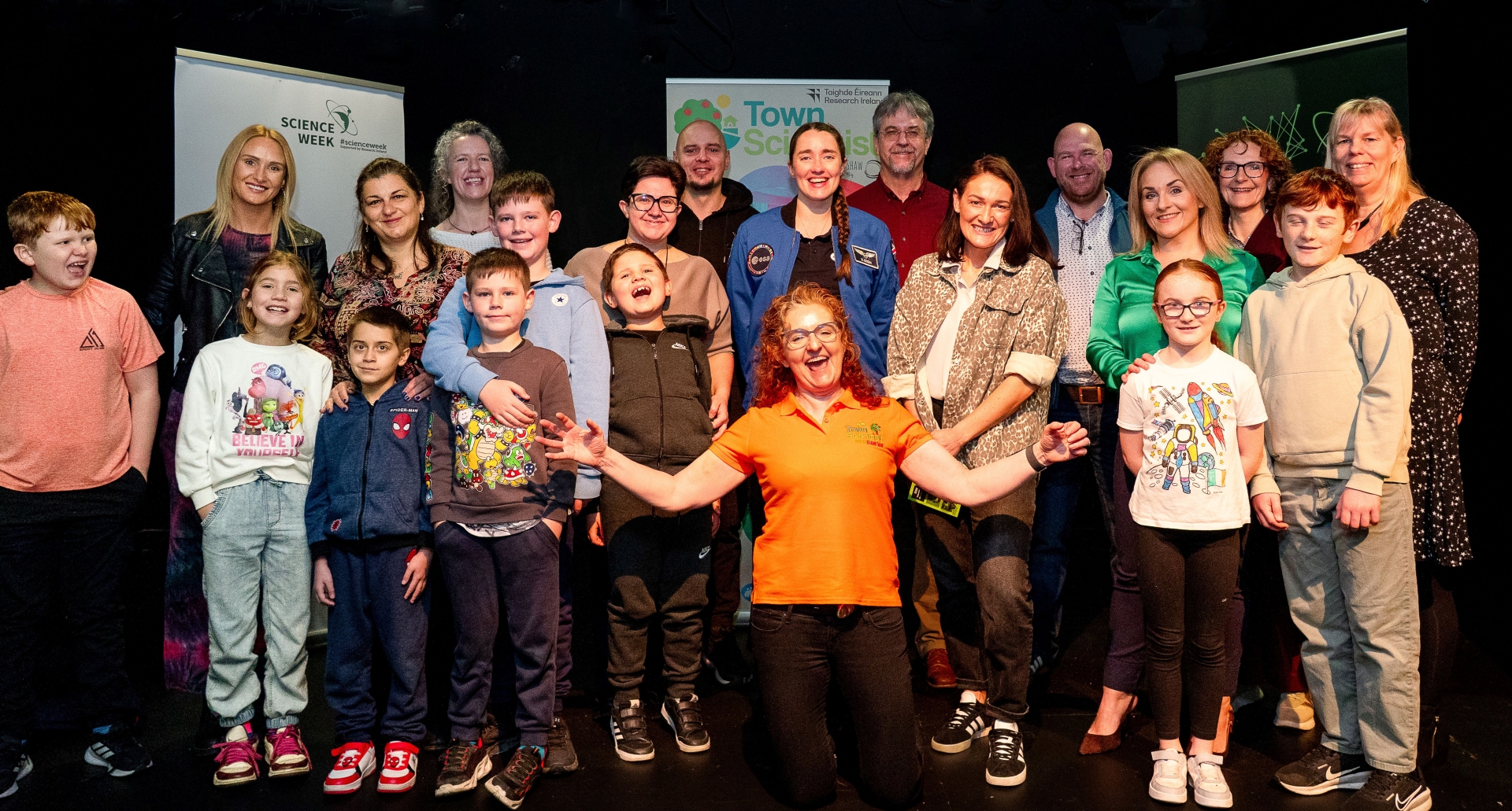 Below: Town Scientist Dr Niamh Shaw and astronaut Rosemary Coogan, with TD Erin McGreehan, Louth County Librarian Mary McHugh, Louth ABC Programme Coordinators Gavin McGee and Sandra Farrell , David Bushman (Town Scientist team) and Naomi O’Donoghue of Dundalk Credit Union with a host of local families who have participated in Town Scientist events. Image: Richie Naylor