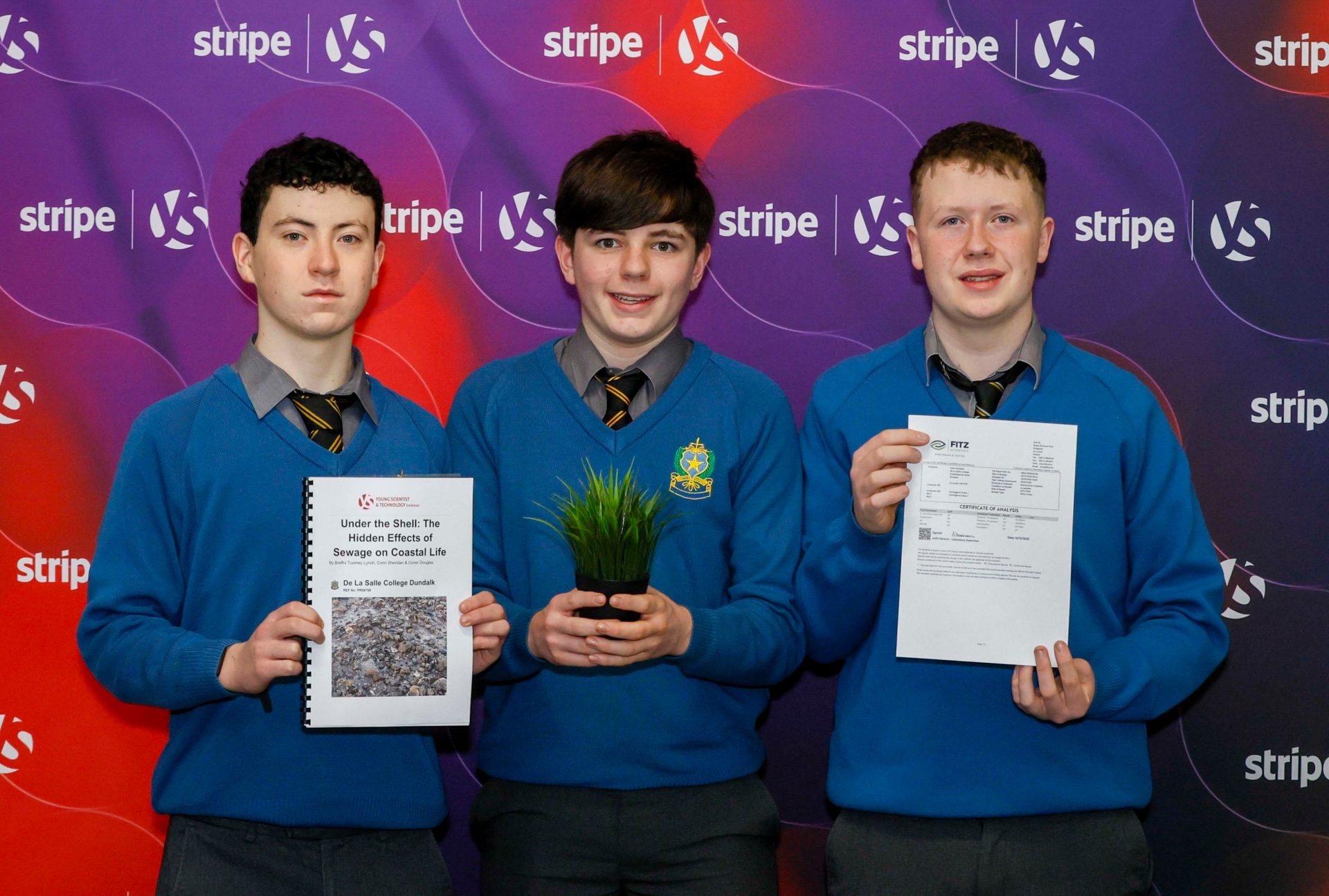Below: Pictured are students Breffni Tuomey Lynch, Conn Sheridan and Conor Douglas from De La Salle College Dundalk in Louth, with their project, 'Under the Shell: The Hidden Effects of Sewage on Coastal Life', at the 2026 Stripe Young Scientist and Technology Exhibition.