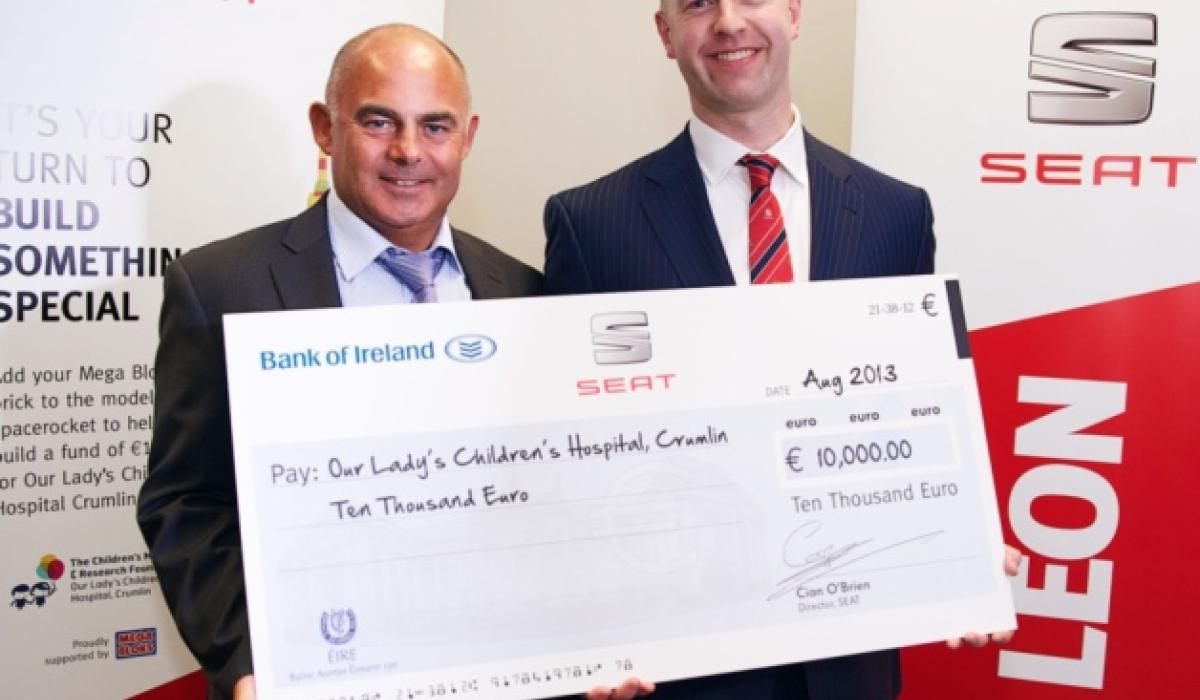 Conachy’s Garage Dunleer helped raise the huge figure of €10,000 for Our Lady’s Hospital Crumlin. Cian O’Brien, Director of SEAT Ireland and Barry Conachy of Conachy’s Garage are pictured with the cheque.