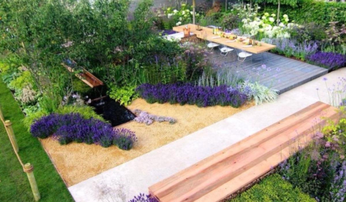 The planting has large drifts of verbena, nepeta and lavender, with a colour palette of purples and blues to create a cool atmosphere on a hot summer’s evening.