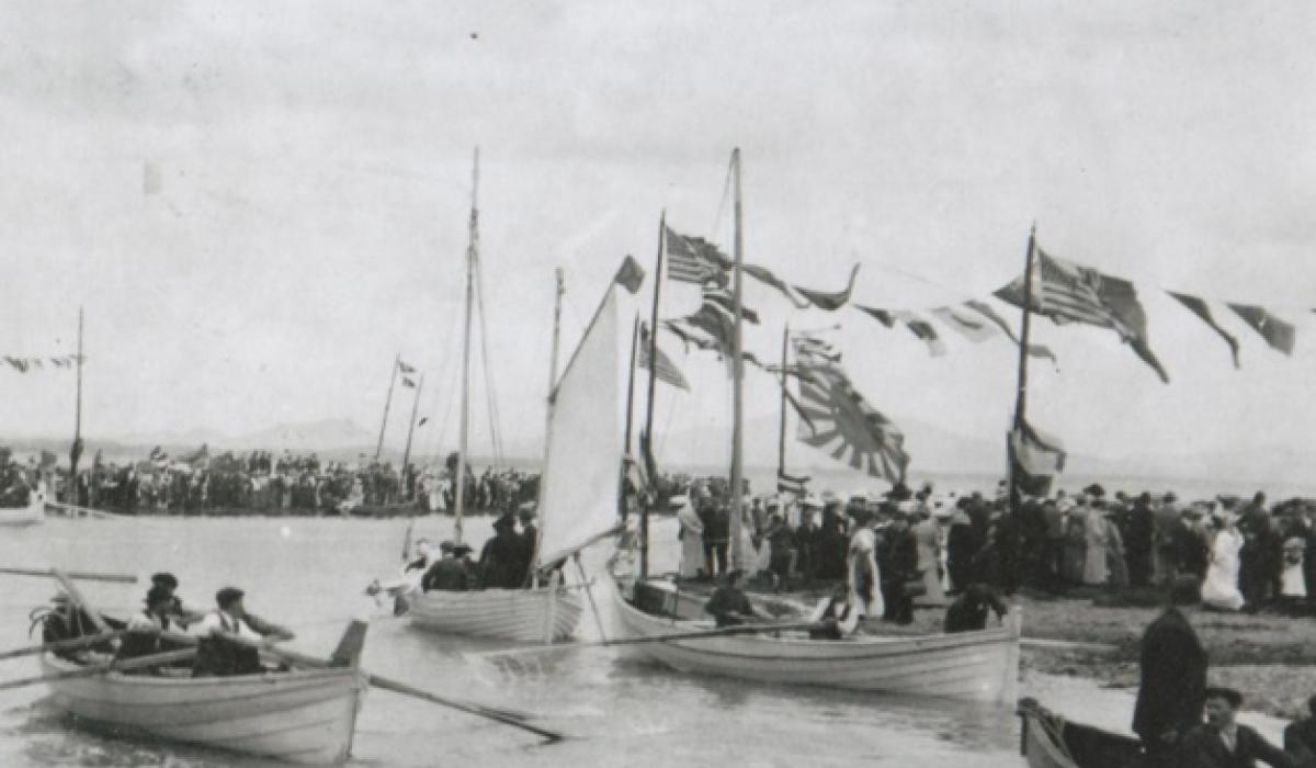 The above photograph shows the crowds gathered at Annagassan. To the right, people have gathered on the shore where the pier now stands. The pier was not built until five years later in 1910.