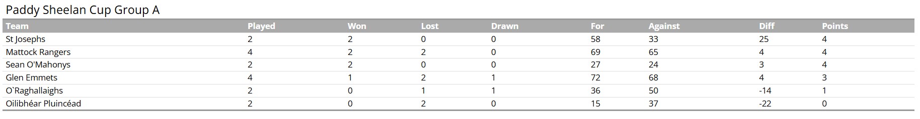Group A – Round 4 - Tuesday, 11th March: Sean O'Mahonys v St. Josephs – Point Road at 7.30pm