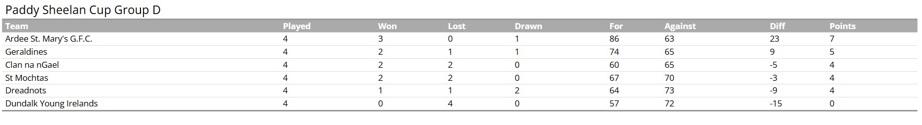Group D – Round 5 - Thursday, 13th March: Ardee St. Marys v Clan Na nGael - Clan Na Gael at 8.00pm; Thursday, 13th March: St. Mochtas v Geraldines - Haggardstown at 8.00pm; Thursday, 13th March: Dundalk Young Irelands v Dreadnots - Pairc Eire Og at 8.00pm.
