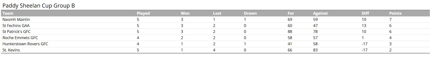 The coming Tuesday night game between Rovers and Roche Emmets could see Emmets join Pats and Fechins for a three-way tie, but Fechins are in pole position to take the second spot because of their head-to-head with St. Patricks and a healthy score difference.