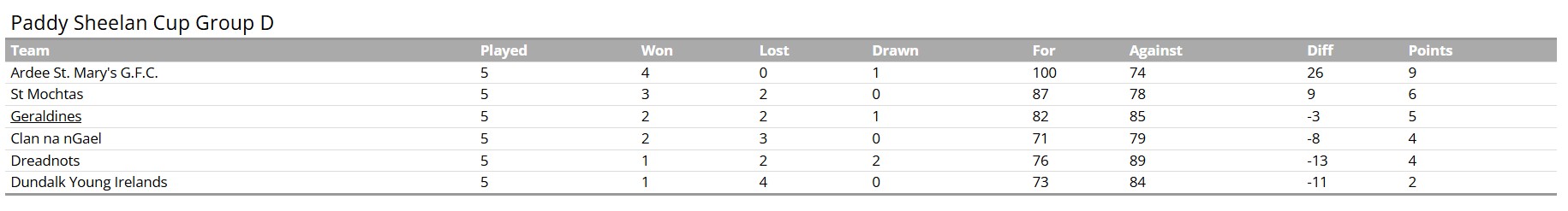 St Mochtas pipped the Geraldines for the runners-up spot in Group D of the Paddy Sheelan Cup thanks to victory at McGeough Park on Thursday evening.