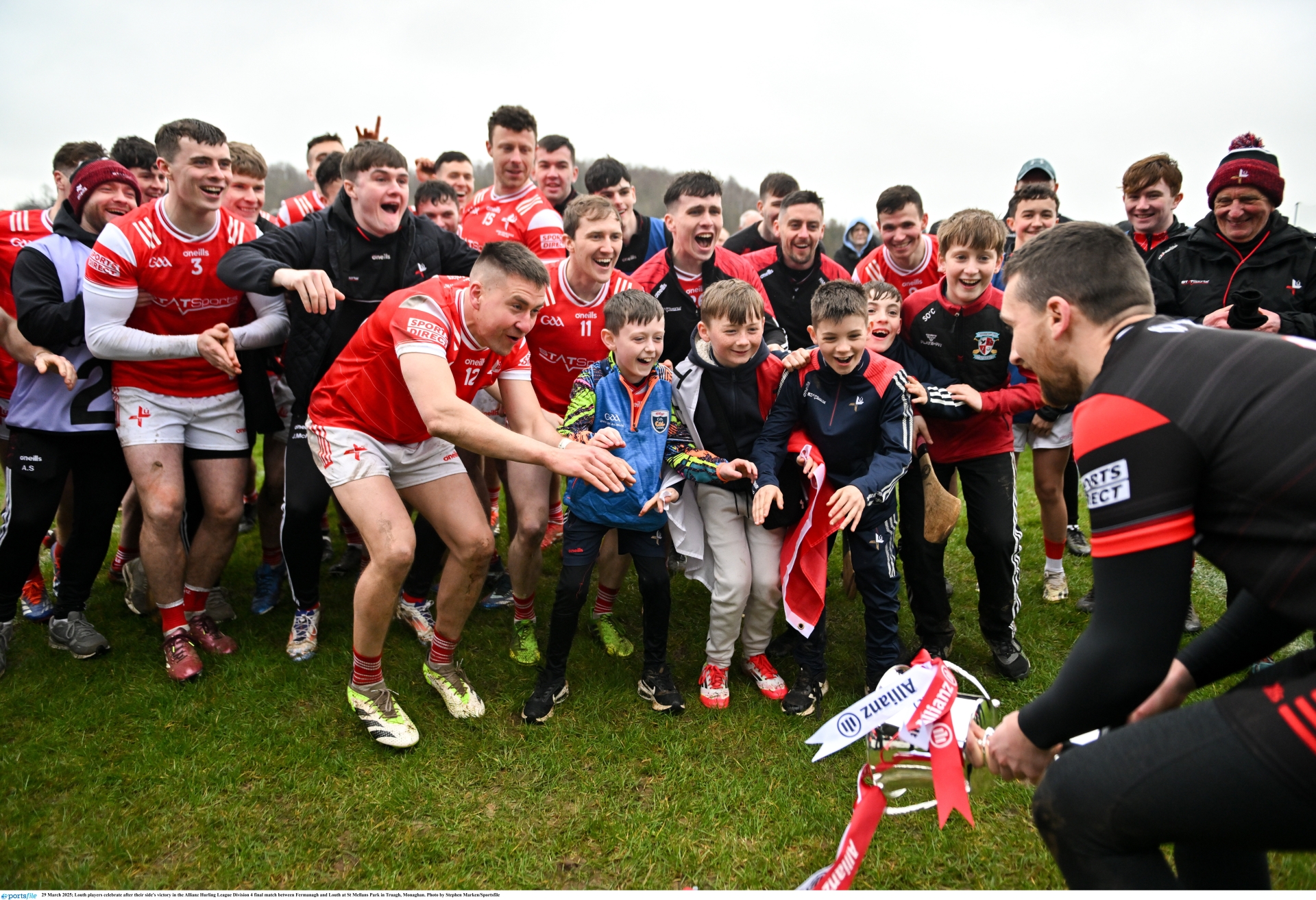 Louth players celebrate after their Allianz Hurling League Division 4 final victory over Fermanagh at St Mellans Park in Truagh, Monaghan. Photo by Stephen Marken/Sporsfile