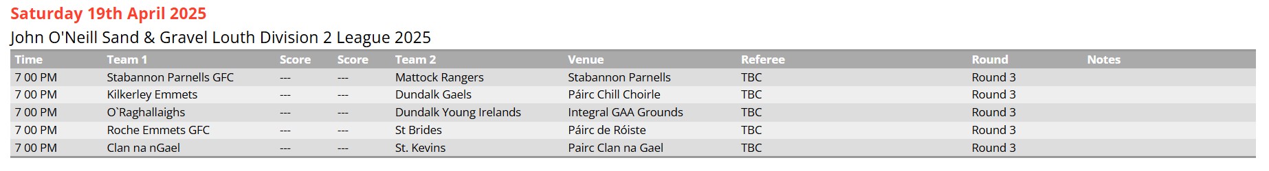 Roche Emmets: Jamie O’Hare; Dermot Carthy, Sean Connolly, Marc Murphy; James McDonnell 0-1, Liam Dawe, Gerry Browne; David Quigley, Glen Stewart 0-1; Daire Reilly 0-1, Shane Byrne, Mark Byrne, Cathal Corcoran, Barry O’Hare 1-4, Fionn Connolly 0-1.
