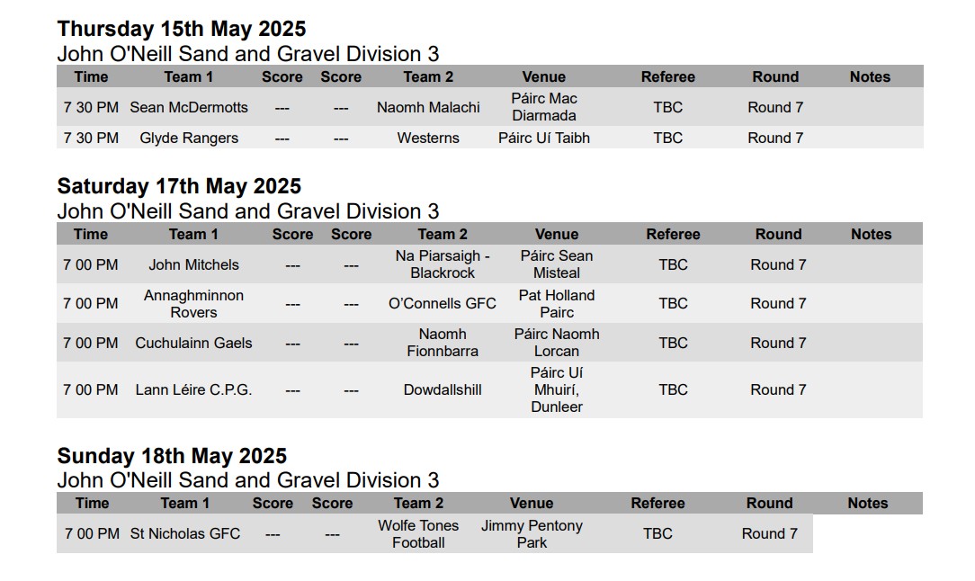 O’Connell’s: Bernard Osbourne; Tadgh Kearney, Jack McGeough, James Walsh; Justin Cooney, Stuart Osbourne, Alan McGovern; Sean Cairns, Cailum Woods; Harry Kierans, Jackie Agnew 1-0, T.J Conlon; Cian Geeney, Robert Quigley 0-1, Niall Conlon 0-7.