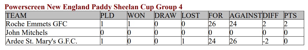 Roche Emmets: Evin Quigley; Dermot Carthy, Aidan Grant, Marc Murphy; Fionn Connolly 0-2 (2p), Callum Grant, Jack McKay; Glen Stewart 0-1, Liam Dawe 1-1; Sean Dawe, Cathal Corcoran, James McArdle; Daire Reilly 1-4, Shane Byrne 0-6 (2p), Mark Byrne 0-1.