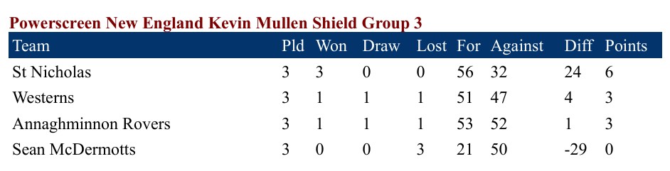 St Nicholas made it three wins from three in Group 3 of the Kevin Mullen Shield when they had six points to spare over Westerns in Drogheda on Sunday morning.