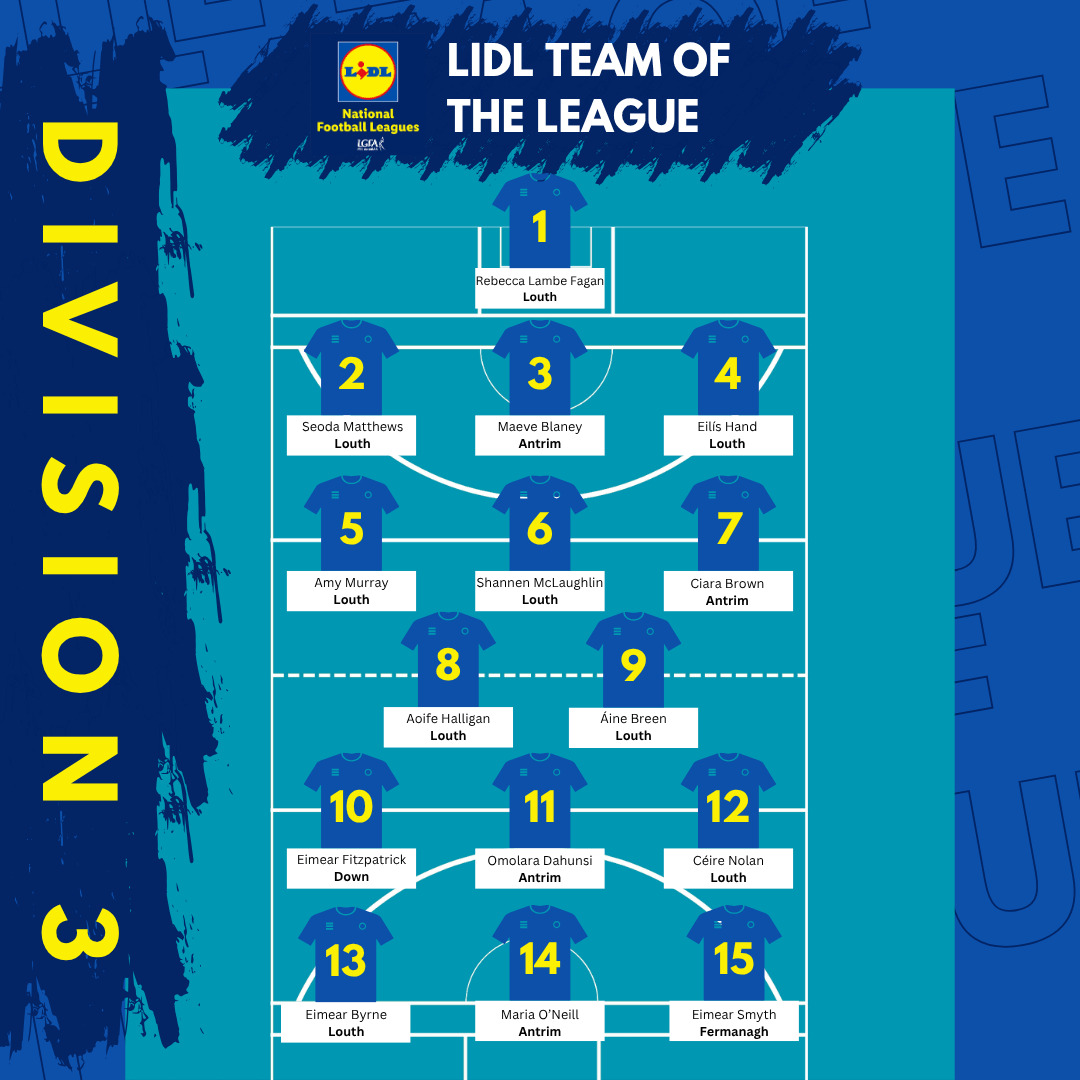 Lidl LGFA National Football League, Division Three, Team of the Year 2026: Rebecca Lambe-Fagan; Seoda Matthews, Maeve Blaney, (Antrim) Eilísh Hand (Louth); Amy Murray (Louth) Shannen McLaughlin (Louth) Ciara Brown (Antrim); Aoife Halligan (Louth); Áine Breen (Louth); Eimear Fitzpatrick (Down) Omolara Dahunsi) Ciére Nolan (Louth); Eimear Byrne (Louth) Maria O’Neill (Antrim) Eimear Smyth (Fermanagh)