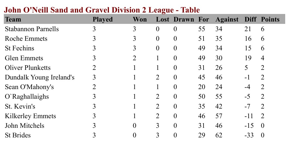 The margin of victory means that the Mid Louth side leads the way at the top of the table ahead of Roche Emmets and St Fechins on score difference.